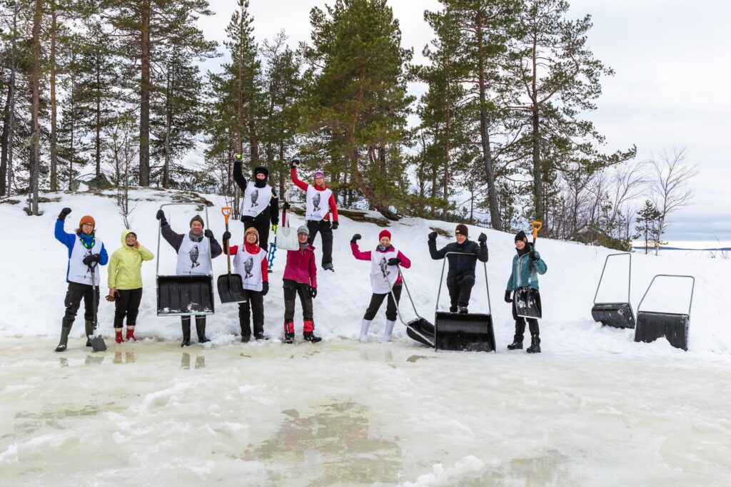 Nyt alkoivat olosuhteet muuttua. Jäälle oli noussut vettä, ja kolmannen apukinoskohteen lumi olikin märkää ja painavaa. Paikalle kolattua lunta saivat lapionaiset ja -miehet tosissaan nostella kinoksen päälle. Mahtava treeni kaikille lihaksille! Mutta niin vain kinos saatiin täyteen mittaan karttaan ennakkoon merkitylle paikalle. ”Tästä tuli kaikkein kaunein”, hankekoodinaattori Hanne Kosonen arvioi tuotosta.