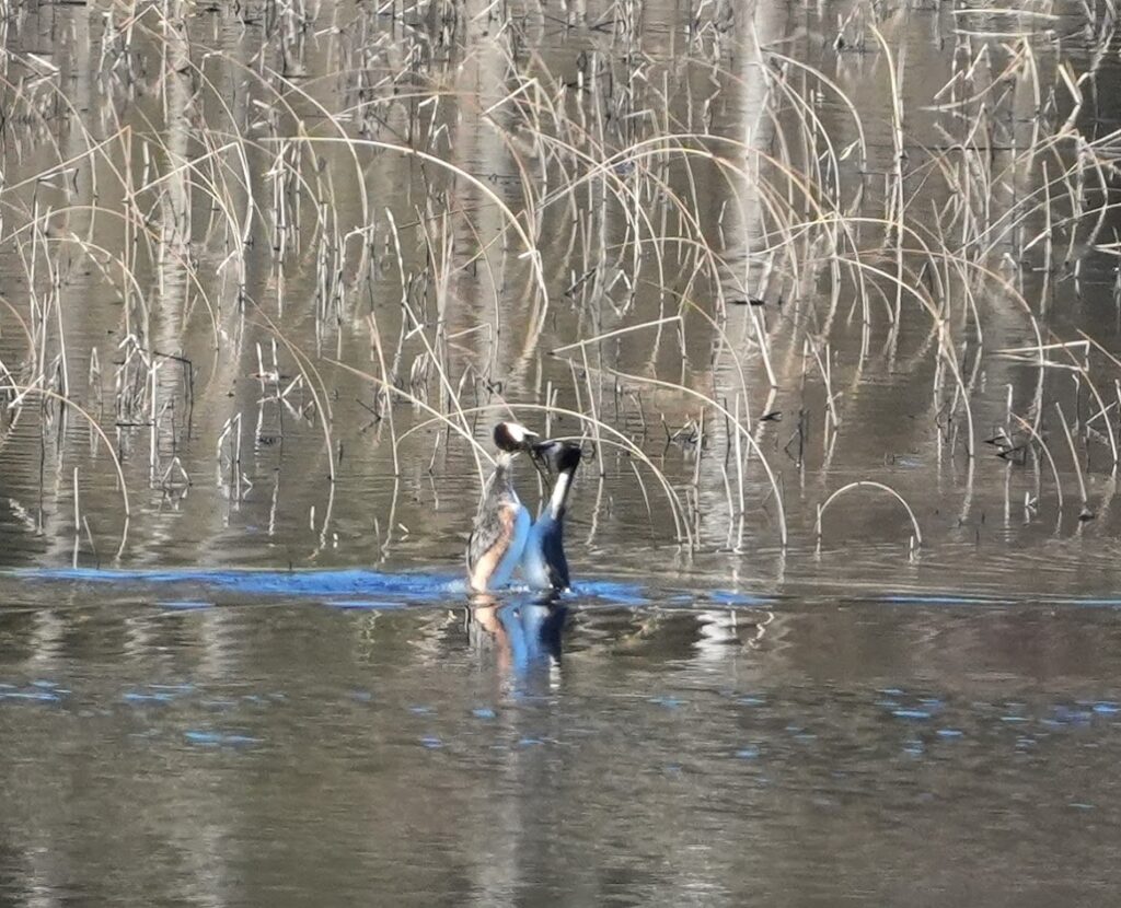 Paikallisia vesilintuja edustivat sinisorsat, haapanat, tavit, tukkasotkapari ja soidintanssejaan esittävät silkkiuikut. Muutolla viipyileviä uiveloita oli kaksi koirasta ja kolme naarasta. Aamun aurinko antoi silkkiuikuille ja veteen hienon sinisen sävyn.