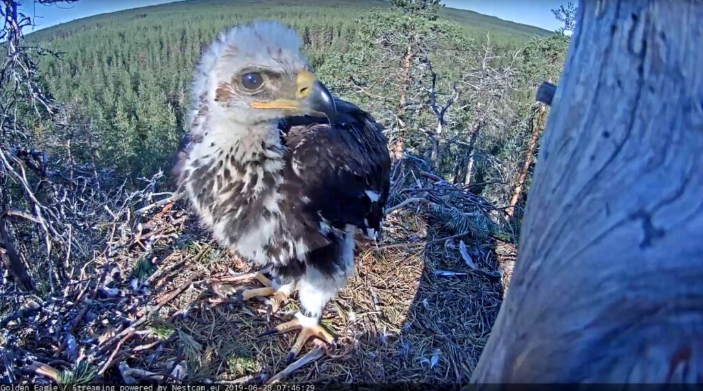 Sattumalta aivan eri pesällä sijainnut maakotkan pesäkamera oli tänä keväänä oikeassa paikassa. Pesäkameran tekniikka petti kevättalvella, eli kamera ei käynnistynyt. Rengastusaikaan kesäkuun alussa pesällä käytiin ja havaittiin, että maakotka pesi kamerapaikalla ja kameran sähkönsyöttö saatiin toimimaan. Alkoi toisen maakotkaparin seuranta, Luonnonsuojeluliiton pesäkameralla. Tässä pesässä varttuu parhaillaan yksi poikanen. Palataan sen elämään piakkoin.