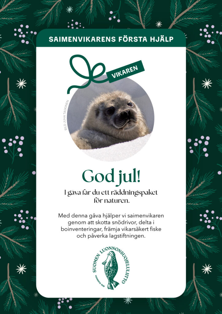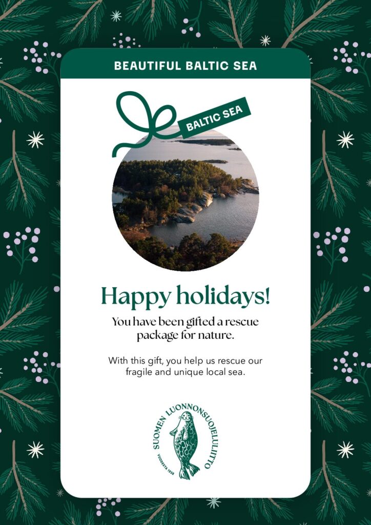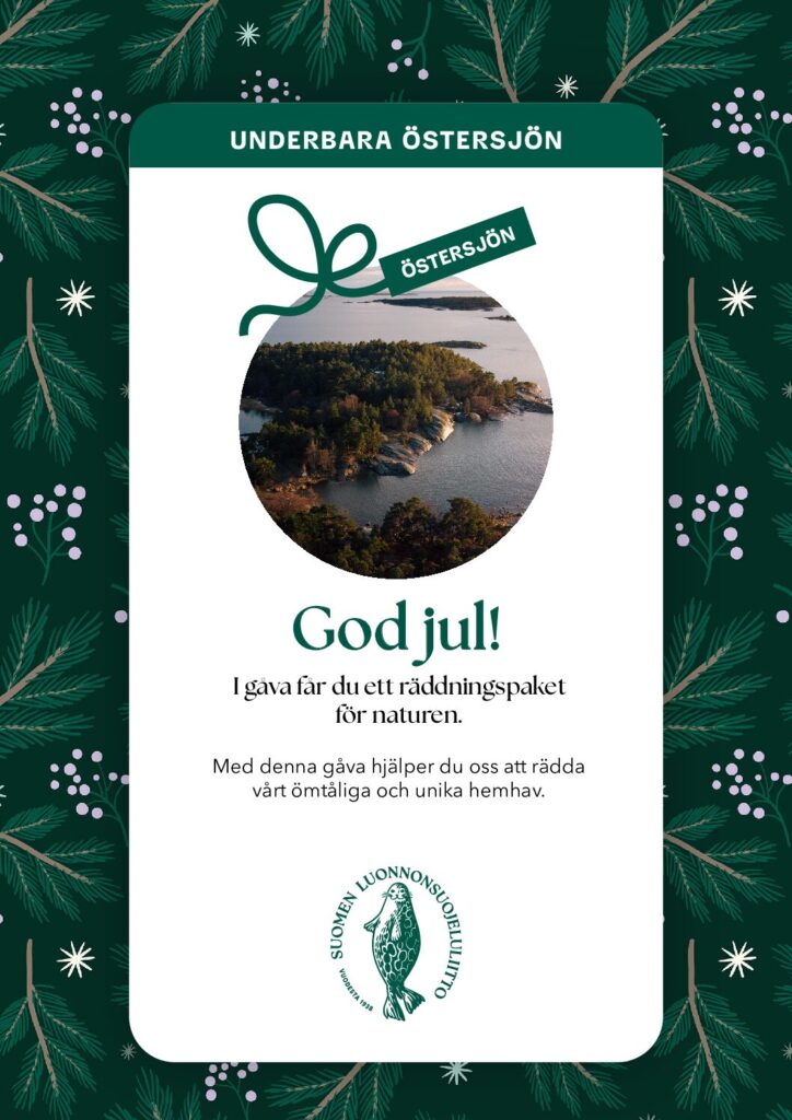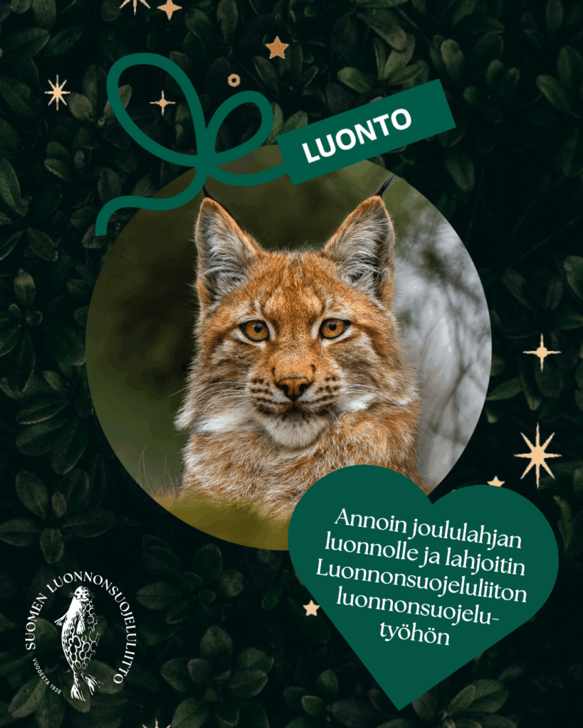 Lahjoituksen tehtyäsi voit ladata Luonnonsuojeluliiton kauniin joulukortin, jolla voit kertoa lahjoituksesta ja lähettää sähköisesti tai antaa tulostettuna lahjan saajalle.