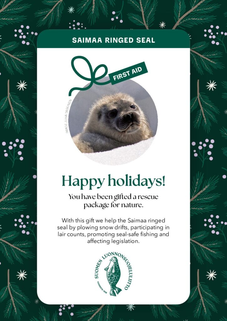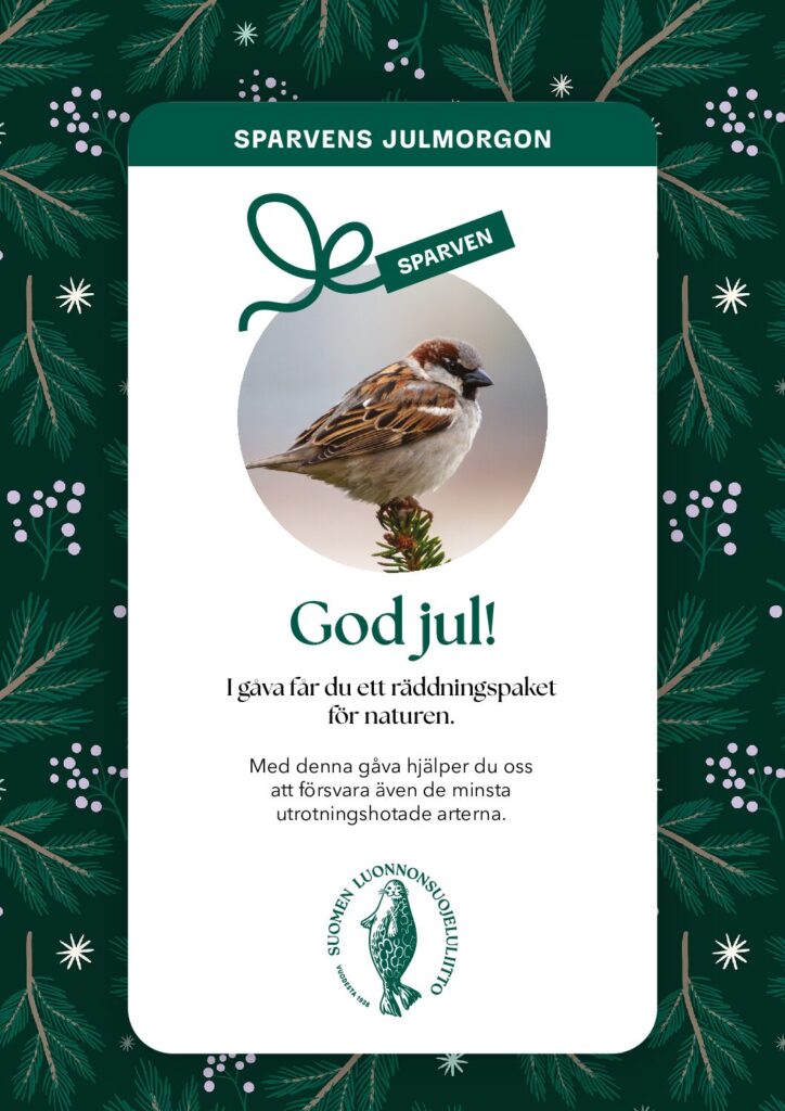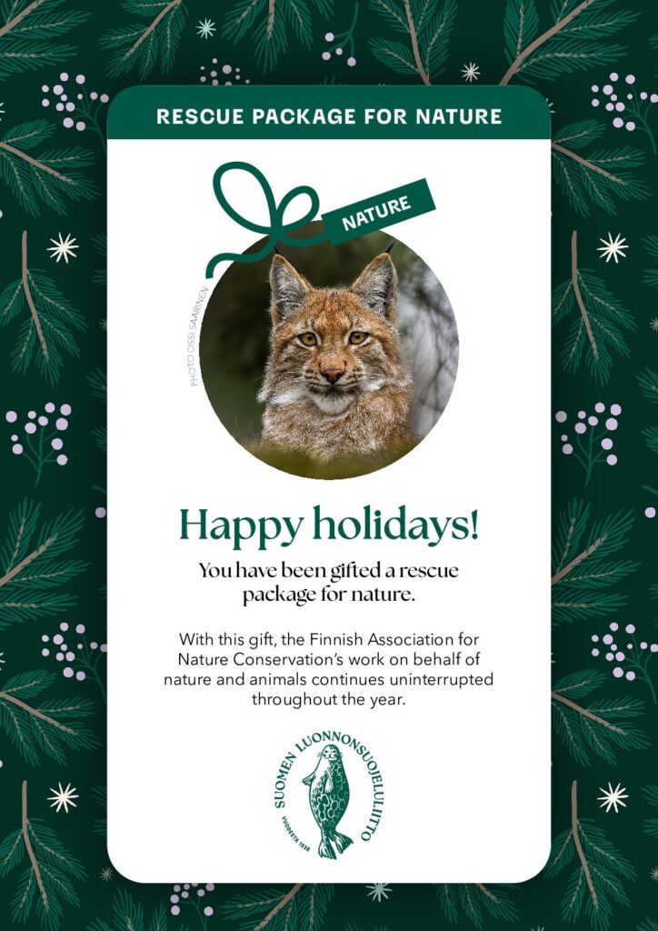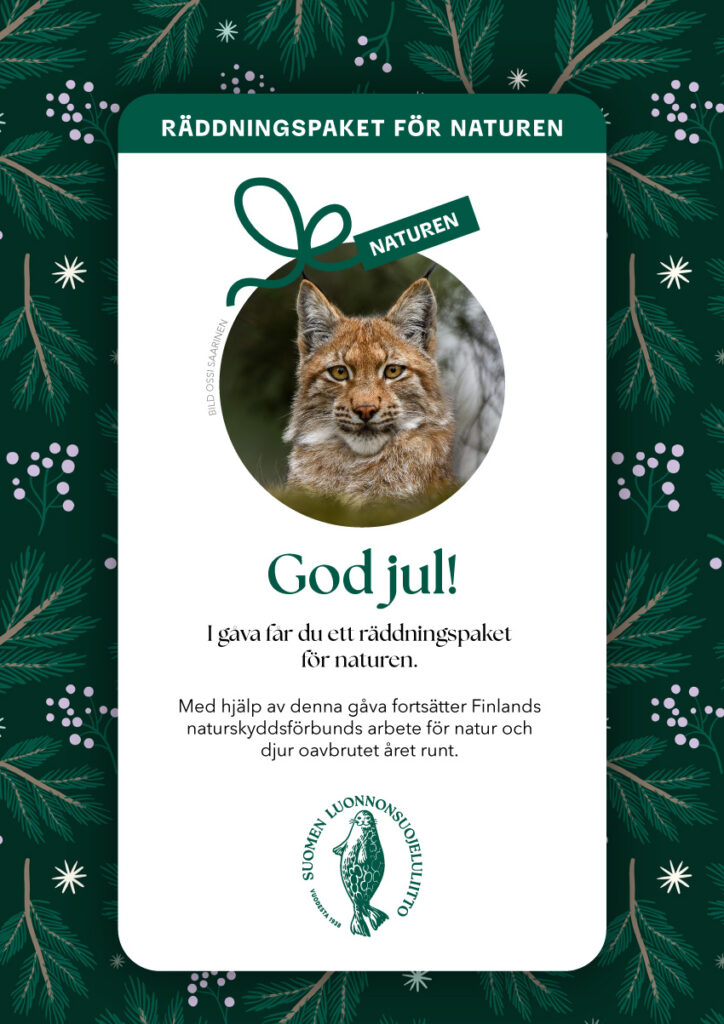 Löydät alta kaikkien neljän luonnon pelastuspaketin joulukortit suomeksi, ruotsiksi ja englanniksi. Korteista on saatavilla sekä sähköiset että tulostettavat versiot. Lisäksi löydät somekuvia, joilla voit kertoa verkostollesi joululahjoituksestasi luonnolle.