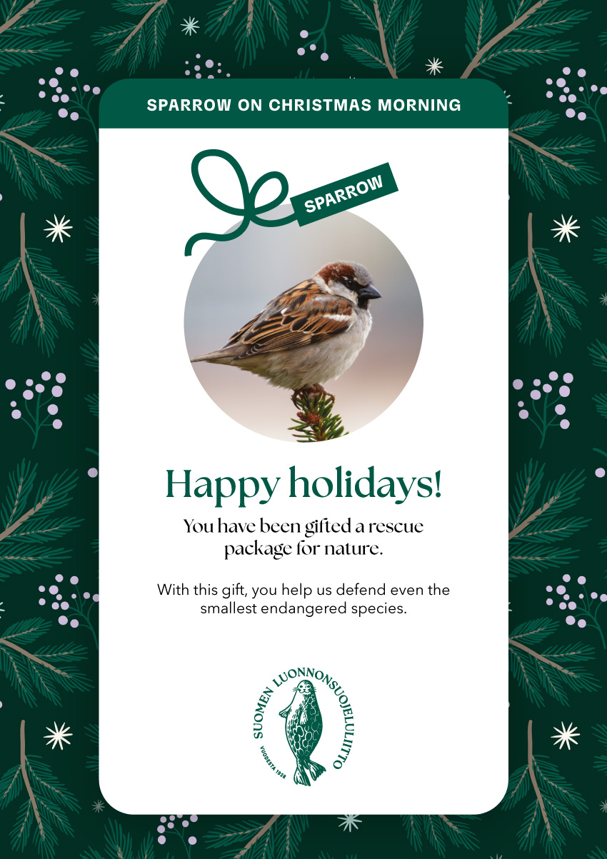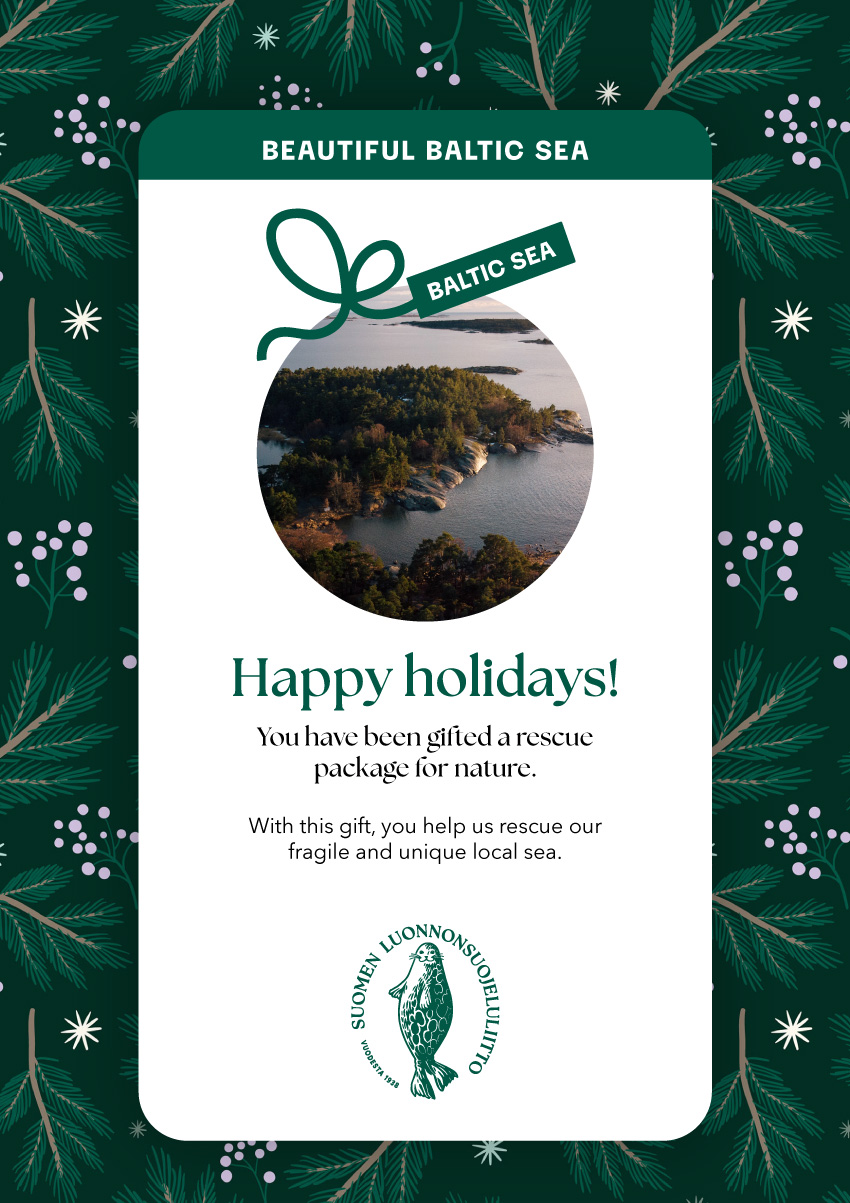 Löydät alta kaikkien neljän luonnon pelastuspaketin joulukortit suomeksi, ruotsiksi ja englanniksi. Korteista on saatavilla sekä sähköiset että tulostettavat versiot. Lisäksi löydät somekuvia, joilla voit kertoa verkostollesi joululahjoituksestasi luonnolle.