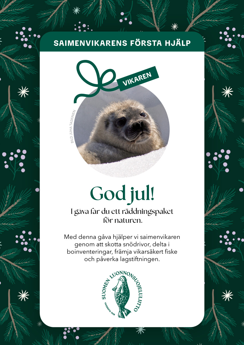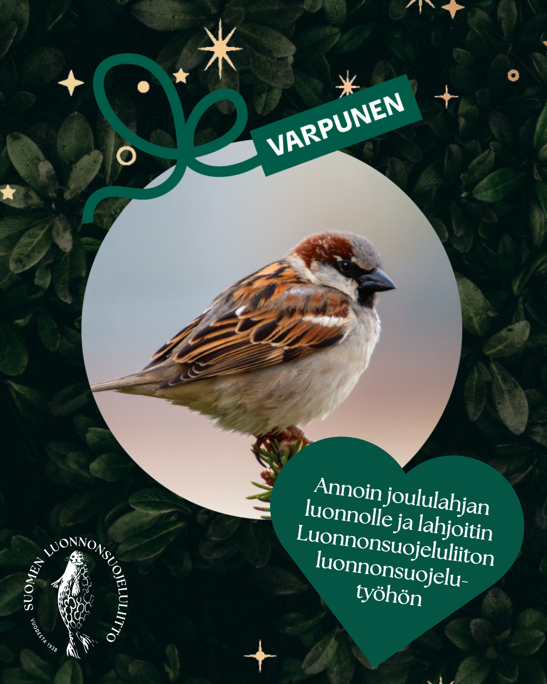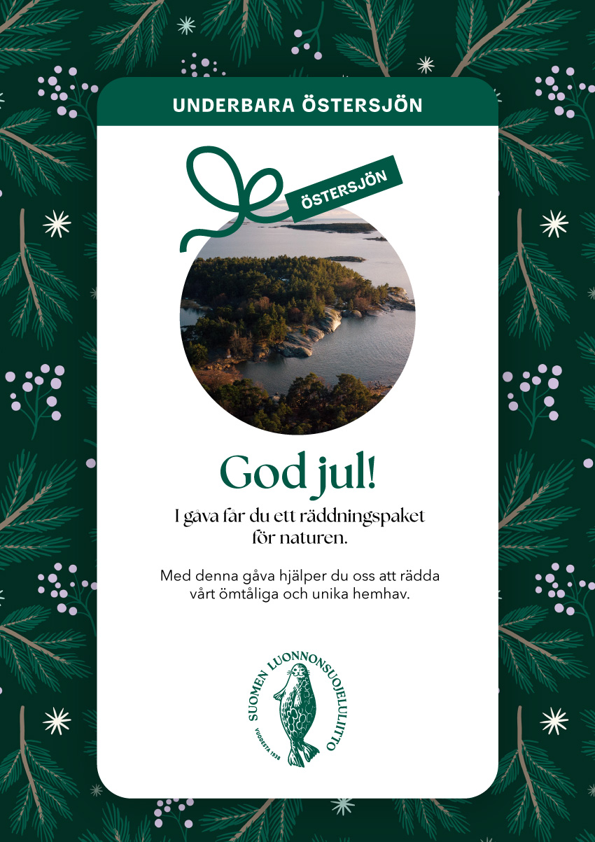 Lahjoituksen tehtyäsi voit ladata Luonnonsuojeluliiton kauniin joulukortin, jolla voit kertoa lahjoituksesta ja lähettää sähköisesti tai antaa tulostettuna lahjan saajalle.
