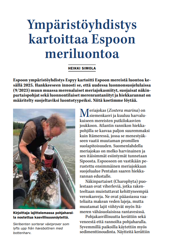 Espoon ympäristöyhdistys kartoitti Espoon meriluontoa kesällä 2025. Hankkeeseen innosti se, että uudessa luonnonsuojelulaissa (9/2023) muun muassa merenalaiset meriajokasniityt, suojaisat näkinpartaispohjat sekä luonnontilaiset merenrantaniityt ja hiekkarannat on määritelty suojeltaviksi luontotyypeiksi. Lue lisää kartoituksista alta.