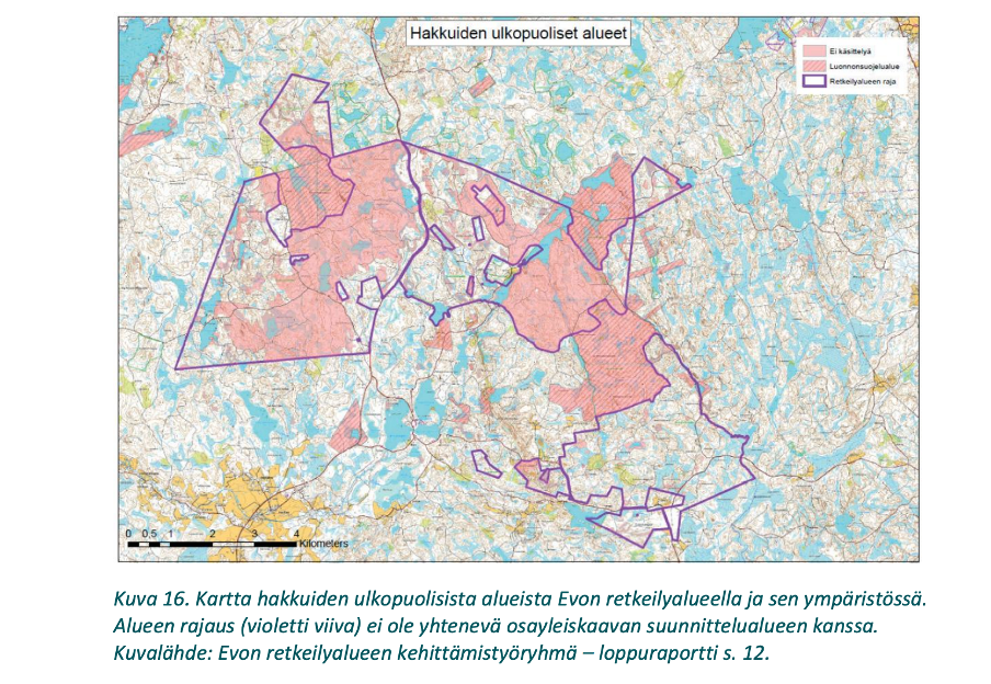 Kuva: Evon retkeilyalueen kehittämistyöryhmän loppuraportti (s. 12 ) Kartta hakkuiden ulkopuolisista alueista Evon retkeilyalueella ja sen ympäristössä.