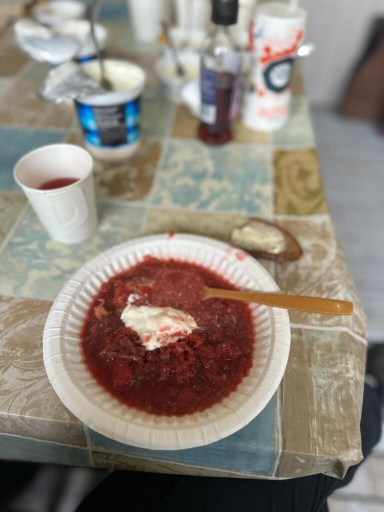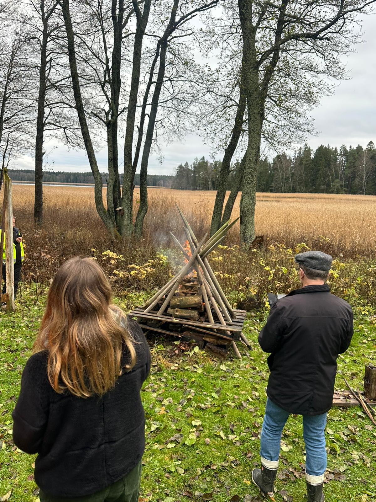 Alustuksen jälkeen sytytettiin kokko, jonka loimussa lämmiteltiin ja ruokopukki tuotiin kokon reunalle – pian sekin sai liekkinsä, kuten perinteiseen kuuluu. Lopuksi pääsimme herkuttelemaan sekä kasvis- että lihaborssilla, smetanan ja ruisleivän kera. Jälkiruoaksi nautimme mustikka- ja puolukkapiirakkaa sekä mausteista kuivakakkua kahvin kanssa – kyllä maistui!