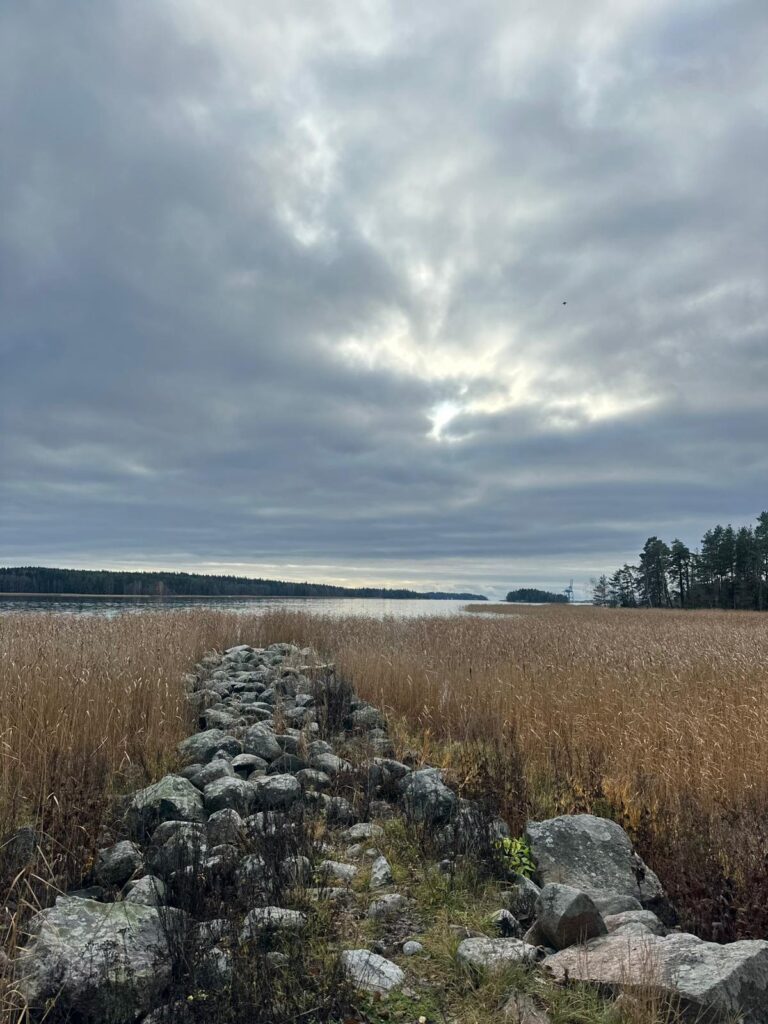 Aamupäivän aloitin kiertämällä niemen ympäri kulkevan luontopolun, jonka varrelta avautui upeita maisemia vihreänä hohtavine sammalikkoineen ja merinäkymineen. Niemen kärjen kivisillan jäännöksiltä saattoi nähdä horisontissa Vuosaaren sataman nosturit ja Karhusaaren. Kiikarit olisivat olleet hyödyksi, sillä eräs osallistujista oli bongannut muuttavia valkoposkihanhia ja jopa kaksi merikotkaa.