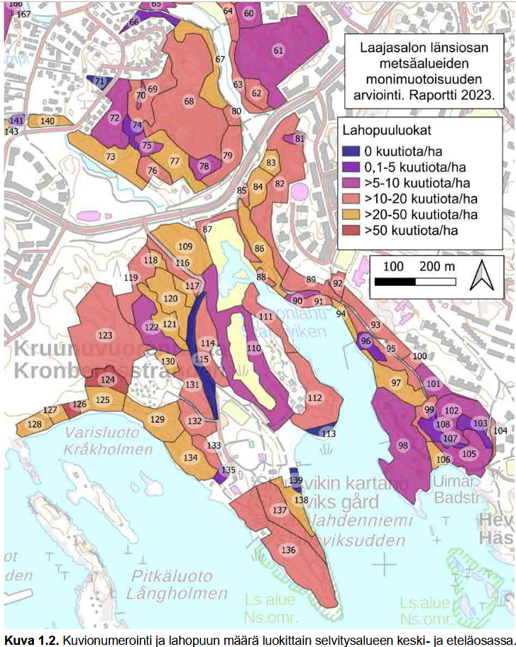 Kaava-alueella on yhtä kuviota lukuun ottamatta yli 10 m3/ha lahopuuta (Faunatica 2023). Etelä-Suomen metsien suojelussa laajasti käytettyjen METSO-kriteerien mukaan luokkaan I päästään, kun lahopuuta on yli 10 m3 /ha.