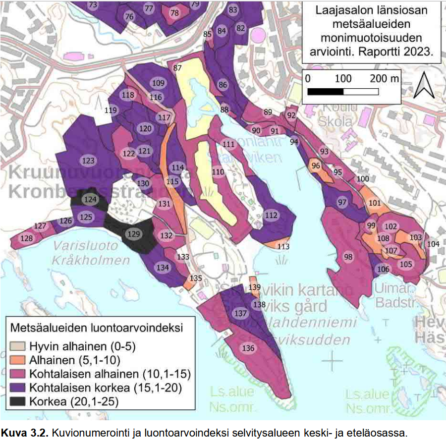 Kaavaluonnoksen materiaaleihin sisältyvän Laajasalon länsiosan metsäalueiden monimuotoisuuden arvioinnin (Faunatica 2023) mukaan kaava-alueen metsäluonto on luontoarvoindeksiltään suurimmaksi osaksi kohtalaisen korkeaa tai korkeaa – siis selvityksen kahta korkeinta luokkaa.