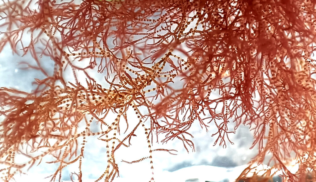 Valokuvassa helmeilevää, joka on saanut nimensä rakenteestaan, joka muistuttaa helminauhaa. Helmilevät kuuluvat punaleviin. Osa Itämeren punalevistä kasvaa syvällä, osa matalammassa vedessä. Tämä irronnut punalevä löytyi Uutelan kalliorannalta Helsingissä. Kuvaaja: Noora Kaunisto.