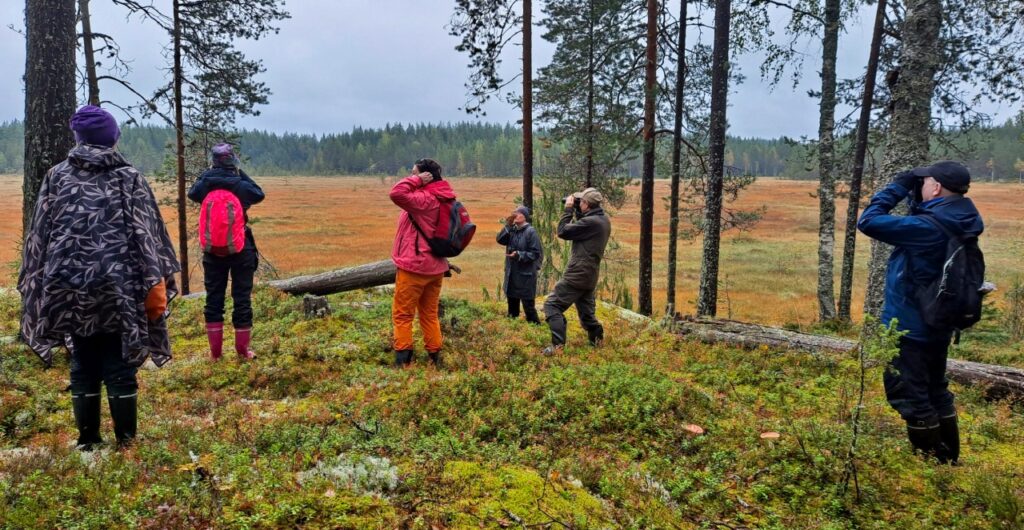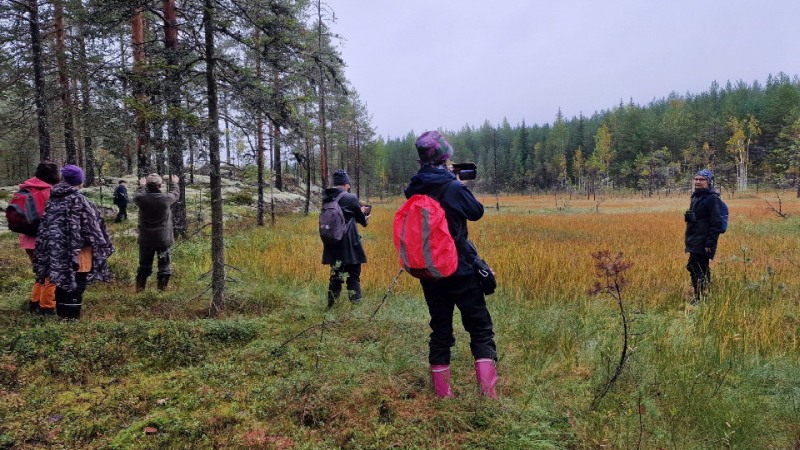 Retken edetessä sade lakkasi ja aurinkokin kuulteli hetken pilvien läpi. Näimme matkalla suon yllä lentävän kalasääsken ja hiirihaukan, suoaukealta nousi taivaanvuohia ja töyhtötiainen tirisi männyn oksalla.