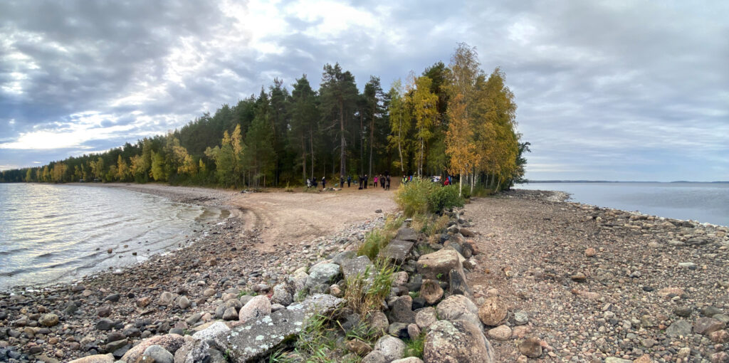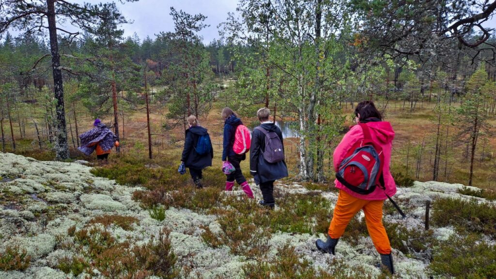 Välillä poikkesimme soiden välissä kohoavalle metsäiselle jäkälän peittämälle kalliolle. Suuremmalta suoaukealta löysimme suon pinnan alle painuneet pitkospuut, jotka tukivat askelta riittävästi ylittäessämme suota kohti vastaisella reunalla sijaitsevaa kotaa. Kodassa evästeltyämme kuljimme takaisin suon yli ja jatkoimme metsäisempää reittiä. Matkan varrella maistelimme suuria maukkaita puolukoita, karpaloita ja mustikoitakin.