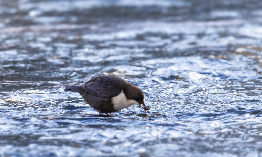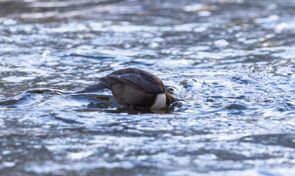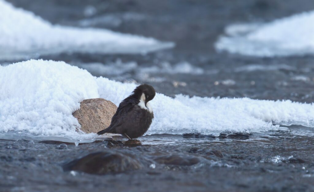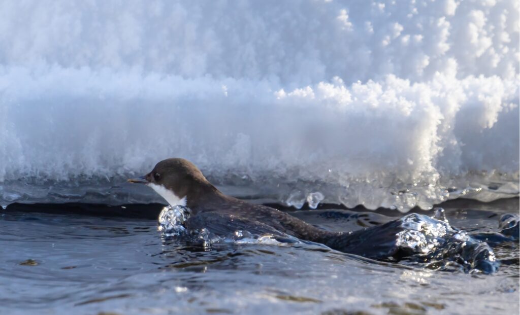 Seuraava pysähdys oli Ritakoskella. Ensimmäinen koskikara löytyi sukeltelemassa kaukana yläjuoksulla. Jään reunalla lumessa näkyi saukon jälkiä, eläimet olivat jossain näkymättömissä.