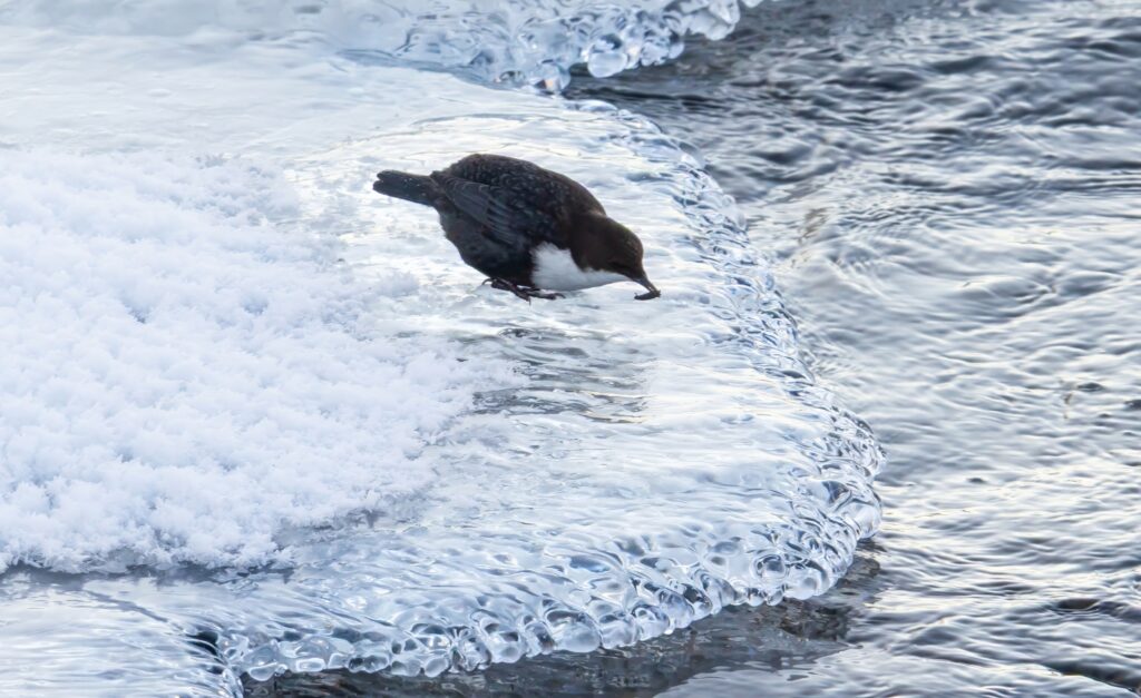 Matka jatkui läheiselle Lahnasenkoskelle. Pitkään jatkuneet pakkaset olivat tehnyt tehtävänsä. Ritakosken ja Lahnasenkosken välinen alue oli kokonaan jäässä. Sulaa oli enää koskien voimakkaasti virtaavissa paikoissa. Sitten kiviä koristavien jää- ja lumihattujen välistä näkyi liikettä. Ensin koskikara vilahti kosken niskalla ja pian löytyi toinen alavirrasta kuohujen lomasta. Lintujen sukeltelua hyiseen veteen pääsi seuraamaan läheltä, joskin valokuvausta haittasi kuohuista nouseva vesihöyry. Aurinko ei vielä paistanut lintuihin ja siksi koskikaran pään tumman pähkinänruskea väri ei tullut esille.