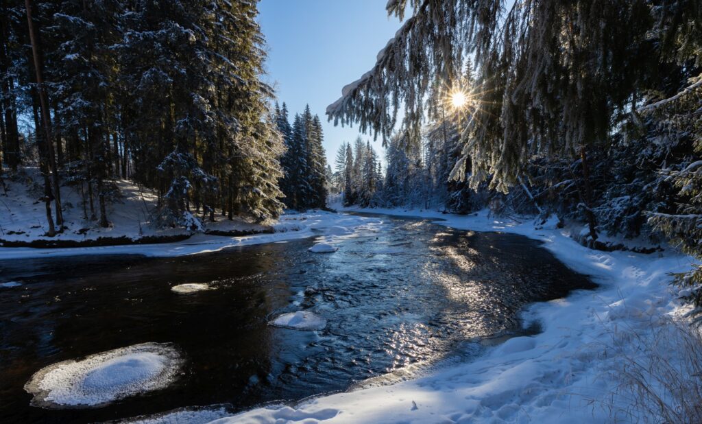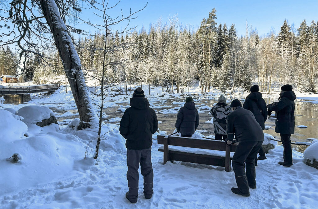 Koskikararetkelle Hiitolan joelle 15.2.2026 oli vain 11 osallistujaa. Liekö pakkanen pelottanut, sillä lähtiessä mittari näytti -18 astetta. Talvisää oli mitä parhain, sillä aurinko paistoi ja oli tyyntä, joten tuulikaan ei nipistellyt poskipäitä.
