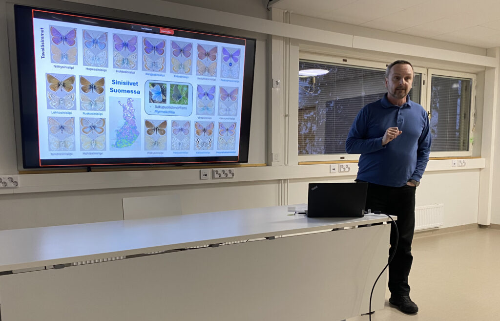 Muurahaissinisiiven tilanteesta Taipalsaarella 3.3.2026 kertoi Kimmo Saarinen yhdeksälle kuulijalle. Taipalsaarella, lajin toiseksi viimeisessä esiintymässä Suomessa, on selvitetty perhosen ja muurahaisten esiintymistä. Perhosen toukka tarvitsee tietty muurahaislajia, kauhasarviviholaista, jotta toukka pystyy kehittymään aikuiseksi. Aluksi millimetrin tai kahden mittainen toukka elää kangasajuruohon kukassa kasvinsyöjänä, sitten toukka tiputtautuu maahan ja houkuttelee tuoksuilla ja äänillä viholaista kantamaan toukan pesäänsä, jossa siitä tulee peto. Jos toukan löytää väärän lajin muurahainen, toukka joutuu muurahaisen ruuaksi. Muurahaislajiston tutkimuksessa on selvinnyt, että kauhasarviviholaisia on Taipalsaarella vähän. Muurahaislajistoa on muutettu perhoselle paremmin sopivaksi. Mutta ollaanko liian myöhään liikenteessä, sillä muurahaissinisiipiä ei alueella ole havaittu pariin vuoteen.