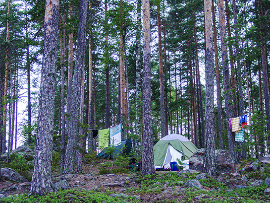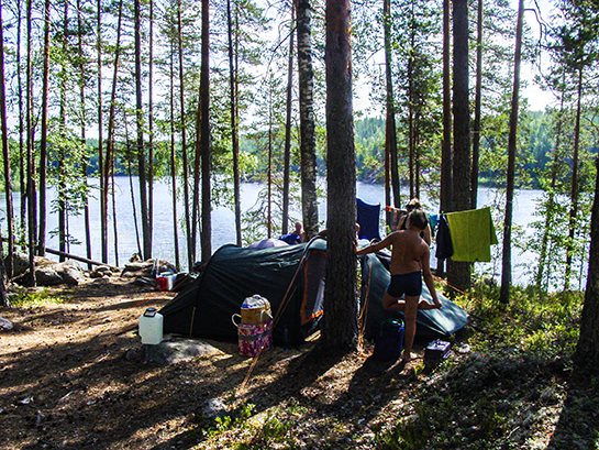 Aurinkoinen ja lämmin sää vallitsi koko retken ajan. Pystytimme telttamme Mustalammen nuotiopaikan läheiseen niemeen.