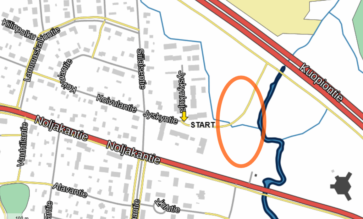 Lähtö Jyskyntien ja Jyskynkujan kulmasta lähtevä pyörätie // Start from the corner of Jyskyntie and Jyskynkuja