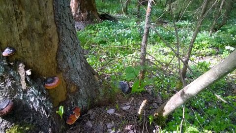 (kuvat 4 – 5). Kasvillisuus on runsas. Ensimmäisenä kukkii näsiä (kuva 6), sitten kellertyvät jokirannat rentukoista ja kohta metsät ovat täynnä valkovuokkoja, kieloja ja käenkaalia. Harvinaisempiakin kasveja löytyy. Lahopuissa kasvaa monenlaisia kääpiä (kuva 7).
