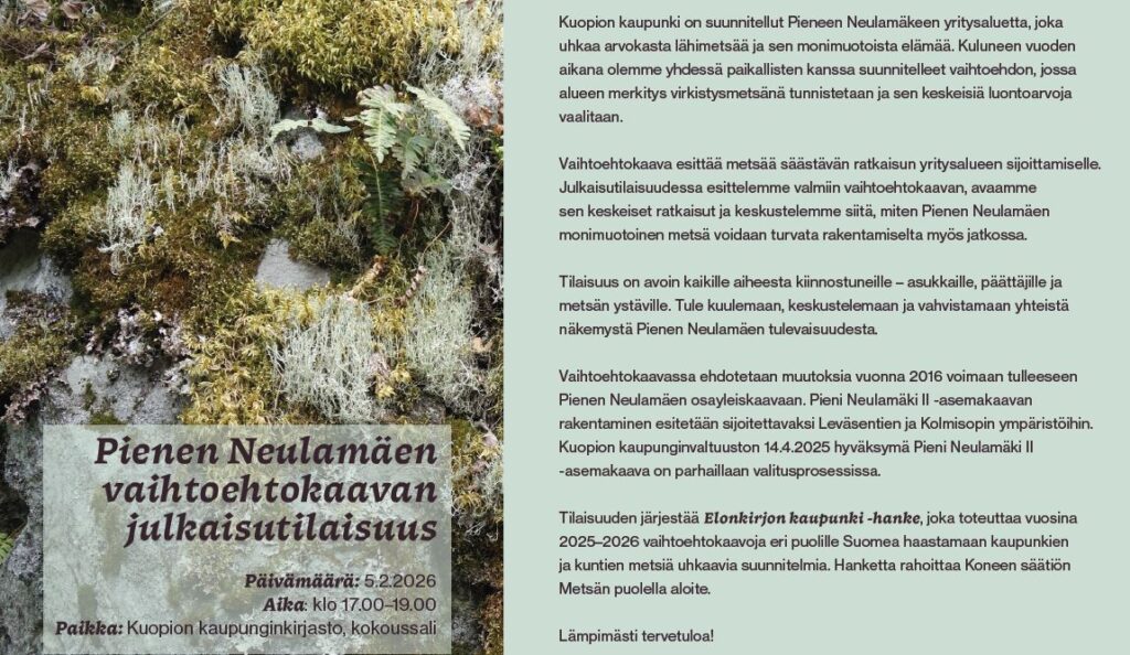 Kuopion kaupunki on suunnitellut Pieneen Neulamäkeen yritysaluetta, joka uhkaa arvokasta lähimetsää ja sen monimuotoista elämää. Kuluneen vuoden aikana olemme yhdessä paikallisten kanssa suunnitelleet vaihtoehdon, jossa alueen merkitys virkistysmetsänä tunnistetaan ja sen keskeisiä luontoarvoja vaalitaan.