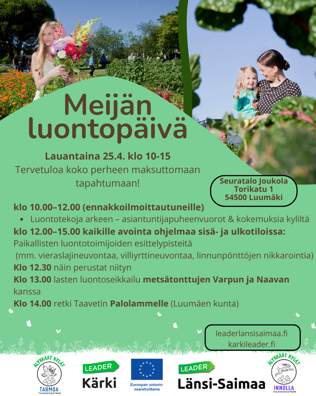 Tervetuloa Meijän luontopäivään Luumäelle lauantaina 25.4.! Tilaisuus pidetään Taavetin keskustassa seuratalo Joukolassa (Torikatu 1, Luumäki). Aamupäivällä ollaan sisällä ja iltapäivällä ulkona – toivottavasti povattu sade ei koleahkossa säässä liikaa pelottele…
