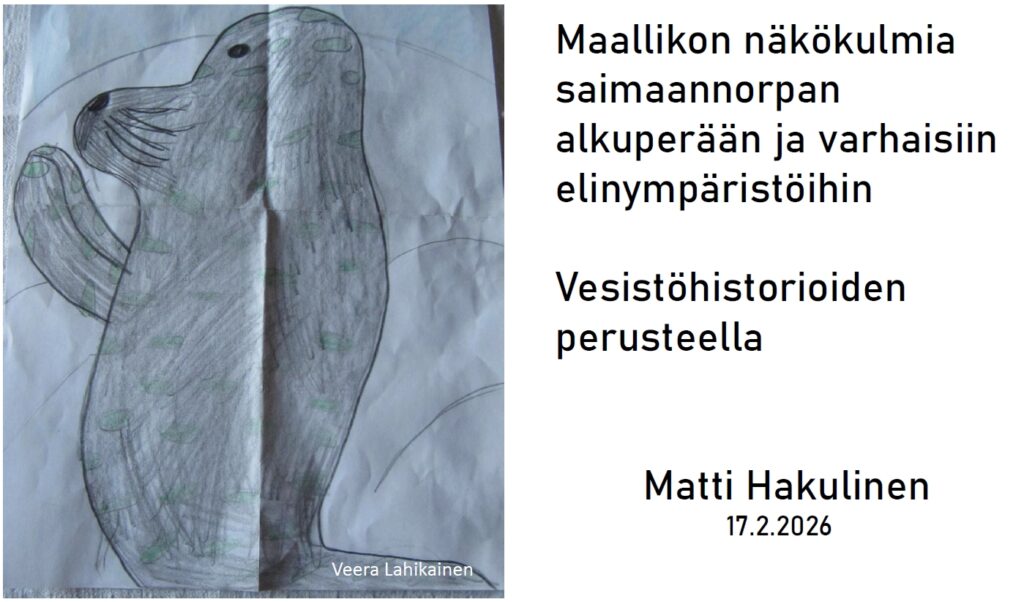 Matti Hakulinen on lupautunut esittelemään norpan elinolosuhteita järvihistorian näkökulmasta. Esityksessä on kaksi pääteemaa, alkuperään liittyvät jääjärvet idässä sekä Saimaan ja miksei Päijänteenkin altaiden norpan elinpiirit altaiden kuroutumisten jälkeen noin 9 500 vuotta sitten. Silloin nykyiset norpparikkaat eteläiset järvialtaat olivat varsin suppeita, mutta pohjoisessa ainakin osin laajempia. Lämpökausikin lienee norppaa koetellut.