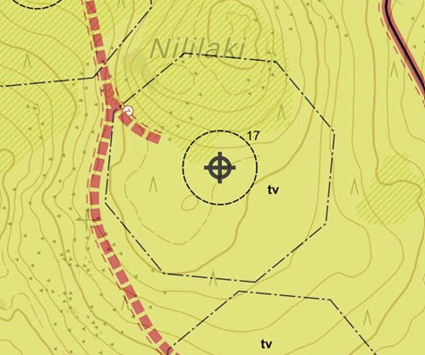 Kuva 1. Kaavoituksen ehdotus siitä, minkä alueen sisällä kaavapaikka voi muuttua. Piisteviiva-alueen halkaisija on 600 m, kaavassa on esitettyä, että alueen sisällä voimala voisi siirtyä keskipisteestä 200 metriä suuntaansa.
