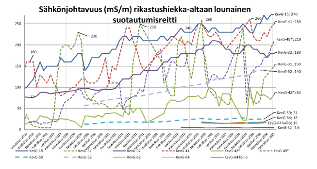 Johtavuudet olivat mittaushistorian huippuluokkaa, vaihdellen välillä 215 – 245 mS/m. Tammikuussa 2025 pisteeltä mitattiin sähkönjohtavuudessa tarkkailuhistorian suurin lukema, 270 mS/m. (Kevitsan pohjavesitarkkailu vuonna 2024 s.27.) Kaivosyhtiö selittää pidempiaikaisen nousevan trendin alueella esiintyvän mustaliuskeen pitoisuuksilla. KevG-15 sijoittuu pohjavesiraportin 2024 Kuvan 2-1 (s.3) mukaan mustaliuskealueen rajalle(Kuva 2-1. Kevitsan alueen kallioperän ja pohjaveden havaintopisteiden sijainteja kartalla). Vuoden 2025 tammikuussa pisteeltä KevG-15 mitattiin uudet huippupitoisuudet kloridia, 480 mg/l. Kaivosyhtiö selittää korkeita pitoisuuksia suojapumppausten aiheuttamilla vesitaseen muutoksilla. Todellisuudessa kloridin nouseva trendi on havaittavissa tarkkailun alusta saakka. (Kevitsan pohjavesitarkkailu vuonna 2024, s.29: Kloridi, rikastushiekka-altaan lounainen suotautumisreitti trendit).