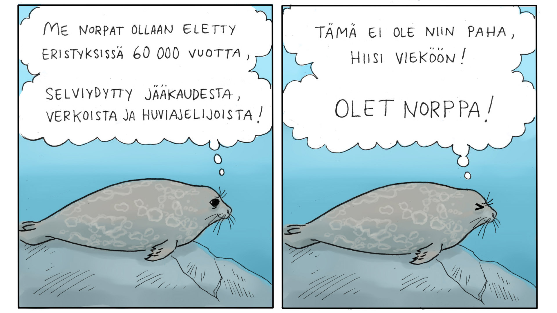 Saimaannorppa päätyi muinaisista jääjärvistä Saimaalle, pärjäili lämpökaudella ja selvisi 1900-luvun vaihteen vainosta. Nyt kalaverkot uhkaavat norpan tulevaisuutta.