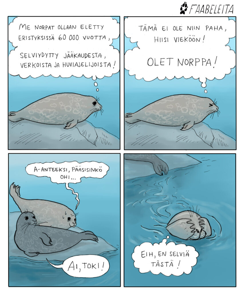 Faabeleita-sarjakuva: Miia Pietiläinen. Julkaistu Luonnonsuojelija-lehdessä 1/2026.