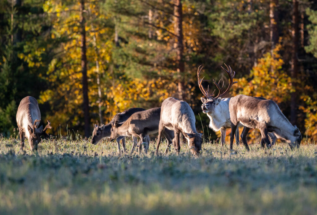 Hirvas seuraa haaremiaan, pyörii vaatimien takana ja niiden keskellä. Välillä se komentaa, mutta vaatimet keskittyvät syömään mehukasta aamiaista.