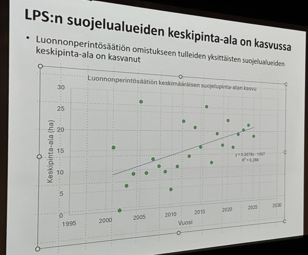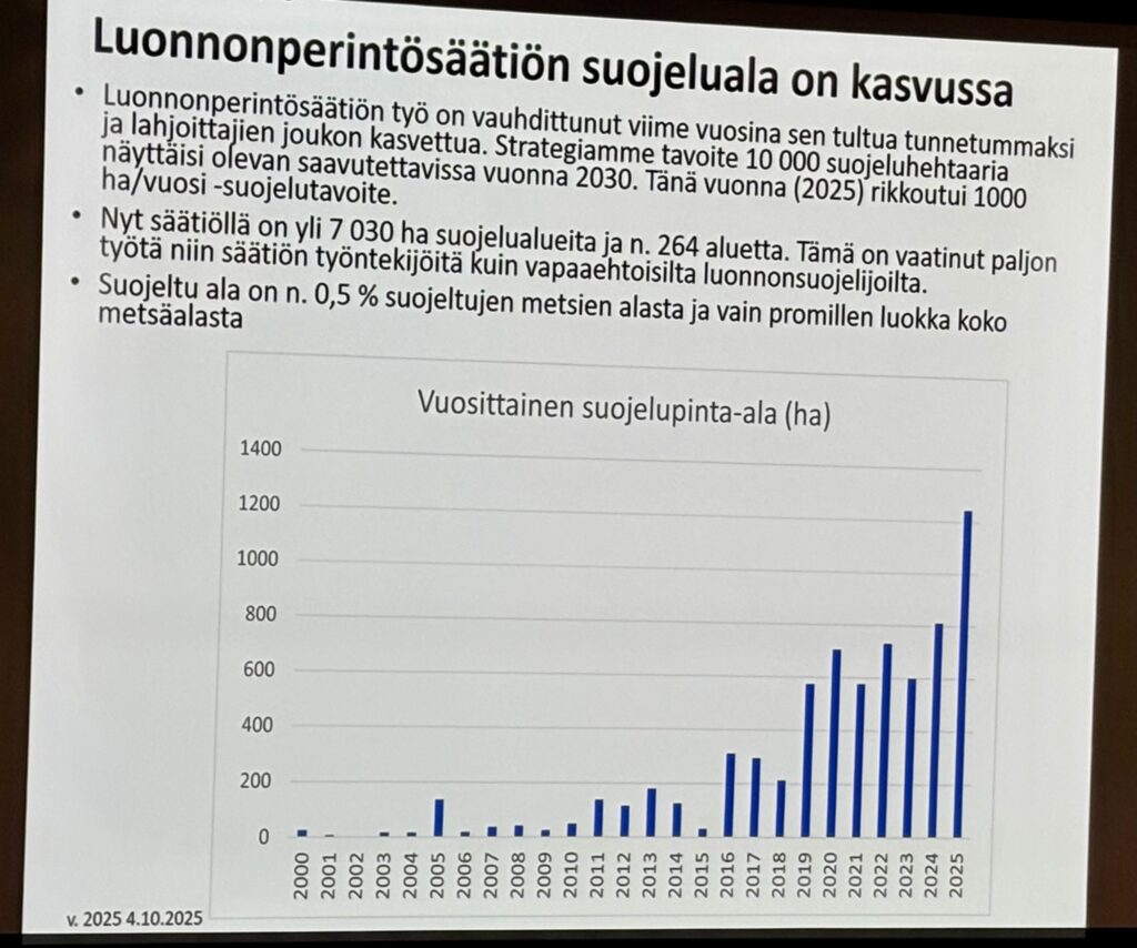 Juhlassa esiteltiin myös säätiön saavutuksia diagrammien avulla. Tässä muutama kuva kertomaan, miten säätiö on edistynyt työssään ja miten suojelukohteita pystytään hankkimaan kiihtyvällä tahdilla. Tämä vuosi on ollut ylivoimaisesti menestyksekkäin. Vuoden 2025 aikana on kyetty lahjoitusvaroin ostamaan yli 1000 ha vanhaa metsää.