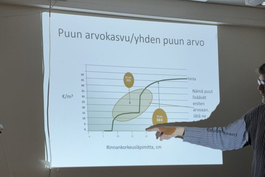 Riston esitelmä perustui osin tilan hoidosta saatuihin kokemuksiin. Risto perusteli esitelmässään selkeästi sen, miksi jatkuva peitteinen metsänhoito on parempi vaihtoehto kuin perinteinen avohakkuu. Taloudellisesti kyse on siitä, että ei kannata kaataa puuta, joka on vasta pääsemässä kasvuvauhtiin. Kannattaa odottaa vähintään siihen saakka, kun puun läpimitta on 25 cm, jolloin puun arvo on noussut 3-4 kertaiseksi. Eli kaadetaan vasta tukkipuuasteelle varttuneet puut ja jätetään pienemmät puut kasvamaan. Näin maanpinta pysyy jatkuvasti puupeitteisenä. Alla oleva kuva havainnollistaa hyvin asiaa. Kuvassa puun kasvukäyrä paljastaa, mistä on kyse.