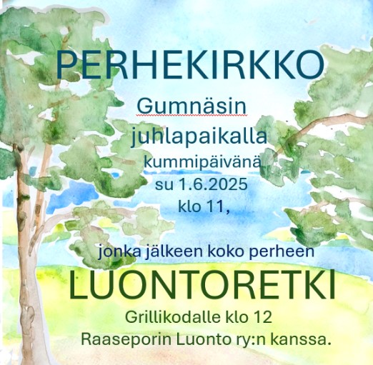 Tervetuloa viihtymään pienelle koko perheen luontoretkelle perhekirkon jälkeen. Kävelemme yhdessä Gumnäsin grillipaikalle, leikimme ja syömme eväitä.