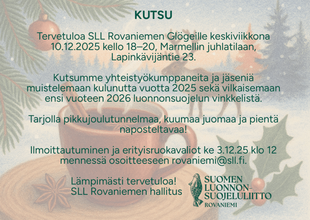 Tervetuloa SLL Rovaniemen Glögeille keskiviikkona 10.12.2025 kello 18–20, Marmellin juhlatilaan, Lapinkävijäntie 23.