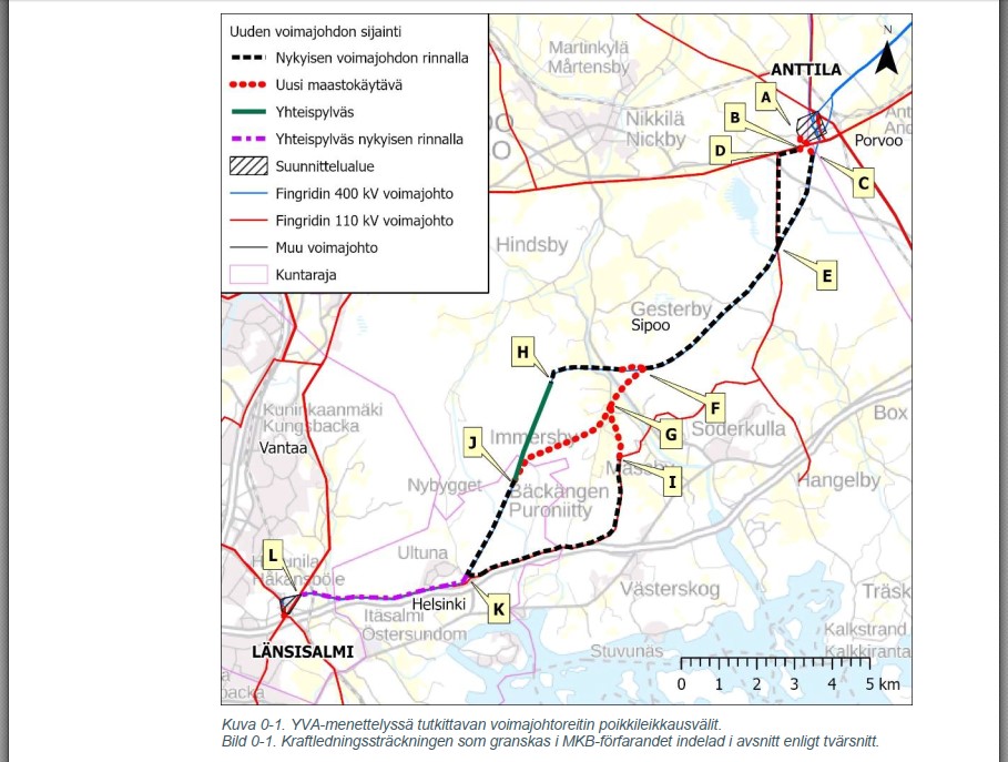 Puroniityn ja Landbon välillä kulkeva osuus (J-K) sijaitsee suureksi osaksi syksyllä 2024 nähtävillä olleen Östersundomin osayleiskaavaluonnoksen SL-alueella, nykyisen voimajohdon yhteydessä. Arvokkaan suojeltavan metsäalueen läpi kulkeva, useiden kymmenien metrien levennyksiä nykyisiin johtokäytäviin aiheuttava uusi voimajohto hävittäisi luontoarvoja ja pirstoisi arvokkaita metsäalueita entisestään. Vastaavasti moottoritien suuntainen voimajohtoaukean levennys heikentäisi pohjois-etelä-suuntaisia ekologisia yhteyksiä entisestään.