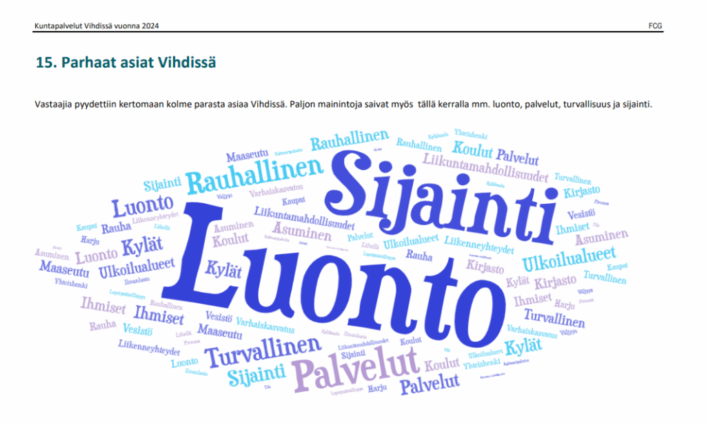 Myös Vihdin kunnan teettämässä Kuntapalvelut Vihdissä 2024 -tutkimuksessa (FCG) vihtiläisten mielestä parasta Vihdissä on luonto: