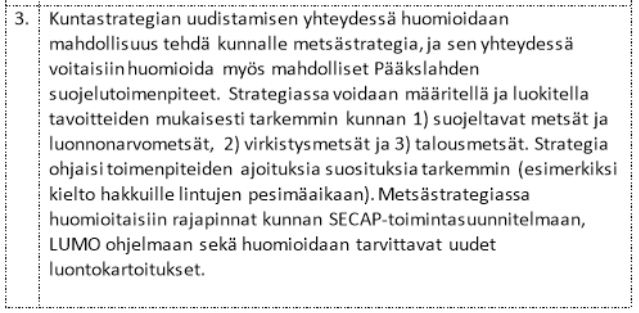 Metsänhoitosuunnitelman hoitotoimenpiteiden suunnittelun ohessa tapahtuva luontoarvojen havainnointi ei ole kunnan metsissä riittävää. Metsien arvokkaat elinympäristöt pitäisi kartoittaa kattavasti metsä- ja suoelinympäristöihin erikoistuneen luontokartoittajan toimesta.