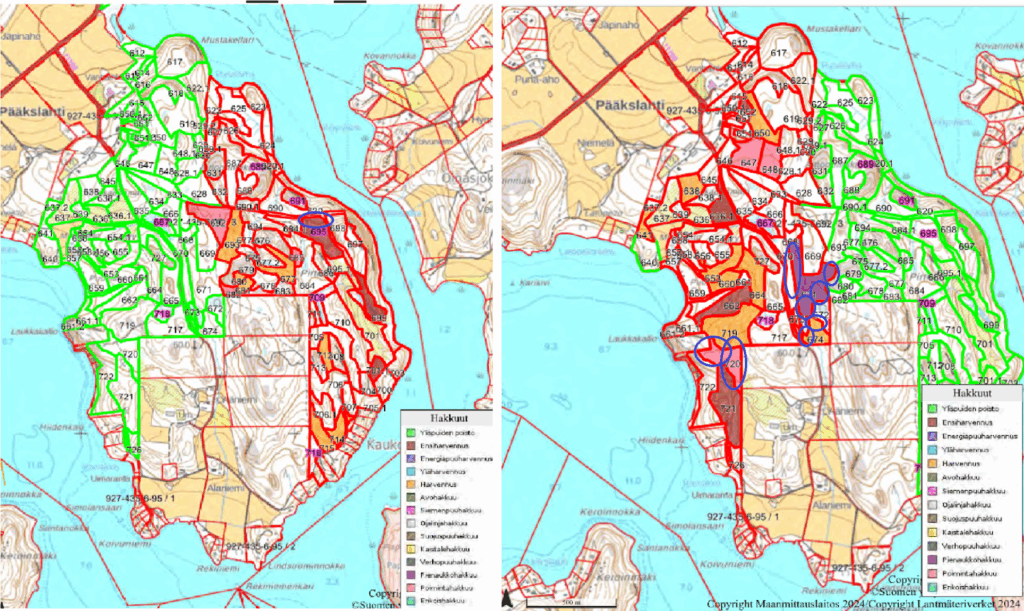Tämän lausunnon Liitteessä 1 on kuviokartalla sinisellä ympyröitynä joitakin kohteita Pääkslahdesta, joilta hakkuusuunnitelmat on ehdottomasti syytä poistaa. Hakkuuehdotusta näillä kohteilla kuvaa hyvin sana ”asiaton”. Esim. kuvion 720 mukana olo edelleen hakkuuehdotuksessa on täysin käsittämätöntä. Karttaan merkityistä kohteista on tarkemmat kuvaukset luonnosvaiheen lausuntomme osassa II.