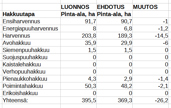 Taulukko 1. Metsänhoitosuunnitelman luonnoksen ja ehdotuksen yhteenvetojen vertailu.