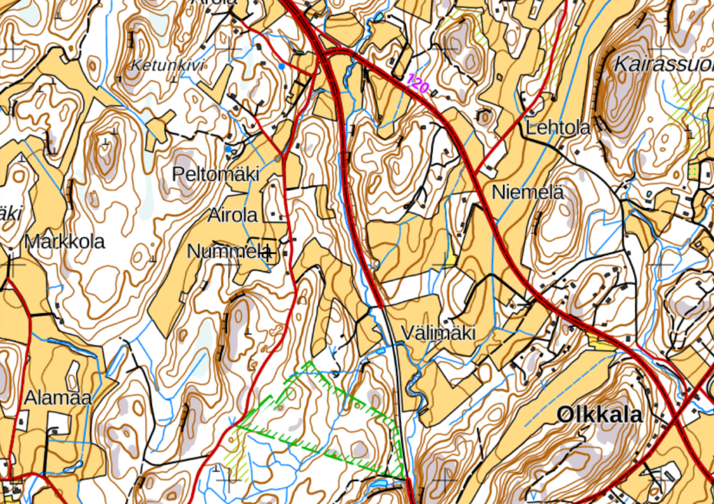 - Yksi esimerkki tieosuudesta, jolla valtatien leventäminen ei ole luontoarvojen takia mahdollista, on Honnonviidan luonnonsuojelualueen ja Vanhan Porintien (mt 120) liittymän välillä (tieosuus näkyy kartalla alla). Vt 2:n välittömässä läheisyydessä on tällä osuudella useita puroja, noroja ja lehtoja sekä liito-oravalle hyvin sopivaa elinympäristöä molemmin puolin valtatietä. Olemme tehneet maastokäynnin alueelle 10.9.2025 ja toimitamme valokuvia kohteista myöhemmin.