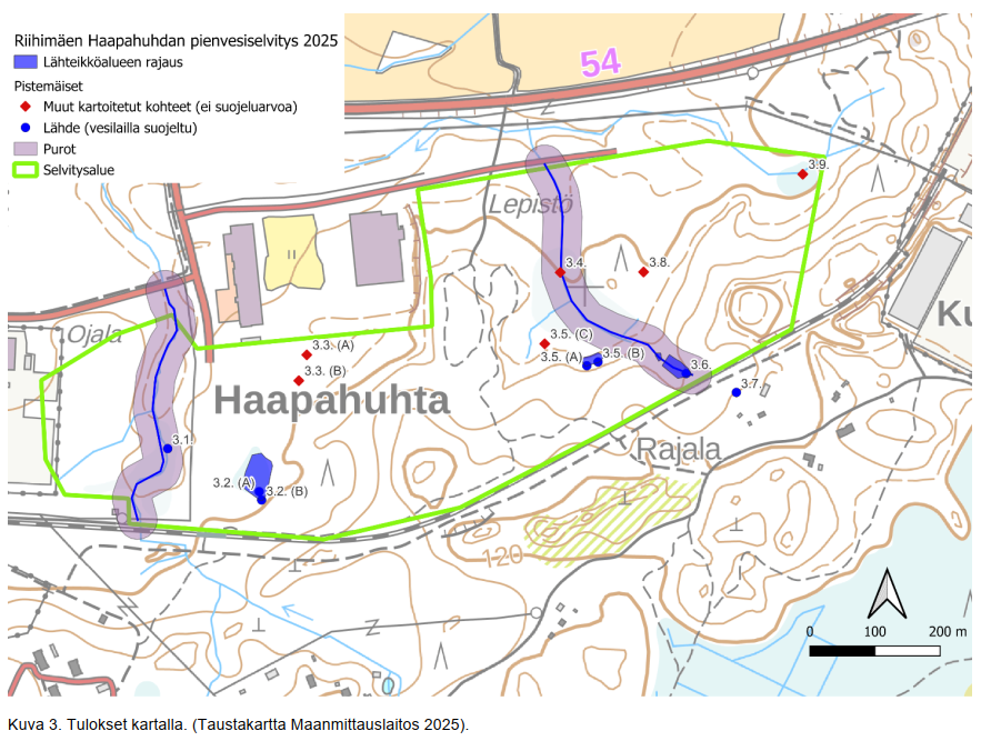 Jo aiemmin tunnetun lähteikköalueen (kohde 3.2. [lisäys tässä: ”Haapahuhdan lähteikkö”]) lisäksi Ojalan purolehdosta löytyi uusimman selvityksen tuloksena uusi avolähde (3.1.). Lisäksi selvitysalueen itäosasta rinteestä havaittiin tihkupinta-alueet (kohteet 3.5. ja 3.6). Varsinaisen selvitysalueen eteläpuolelta radan toiselta puolelta havaittiin myös lähde (kohde 3.7.). Rinteessä etelä-pohjoissuuntaisesti virtaavassa uoma ei ole luonnontilainen, mutta uomaan on kehittymässä luonnontilaisen noron ominaispiirteitä (kohde 3.4.). Muista selvitetyistä kohteista ei havaittu vesilain mukaisia pienvesiä.