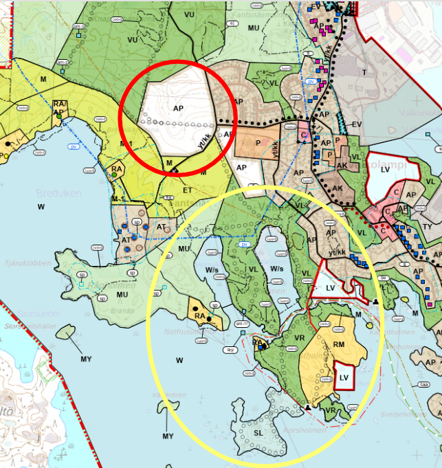 Laaja metsään rajattu AP-alue Hiekkaharjuntien ja Korsviikintien välissä (punainen ympyrä alla kuvassa), nykyisen taajamarakenteen länsipuolella, katkaisee tärkeän metsäisen ekologisen yhteyden kaava-alueen eteläosasta pohjoiseen. Kaava-alueen eteläosassa on kaavan luontoselvityksissäkin tunnistettu erittäin merkittävä erilaisten metsäisten ja rantaluontoon liittyvien luontoarvojen keskittymä (keltainen ympyrä alla kuvassa; mm. Korsholmenin luonnonsuojelualue, Tavistholmen, Hässjeholmen, Brasvikenin ja Hemvikenin ympäristöt).