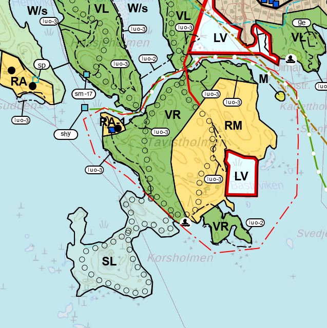 Tavistholmenin alue Valkon OYK:n kaavakartalla ja RM-aluetta koskeva kaavamääräys: