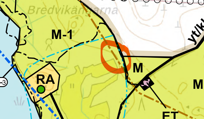 Bredvikenin pohjoisrannalla on luonnonsuojelulain suojeleman tervaleppämetsän (luo-1) päälle merkitty RA/AP-alue ja uusi loma-asunnon tai vakituisen asunnon salliva rakennuspaikka (ympyröity vihreä piste kaavakartalla alla). Rakennuspaikka olisi ollut mahdollista sijoittaa RA/AP-rajauksen sisällä myös hieman pohjoisemmaksi luo-1 -alueen ulkopuolelle.