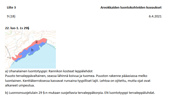 Kaavamääräys luo-1 -alueille kuuluu (liite 5): ”Luonnon monimuotoisuuden kannalta erityisen tärkeä alue. Alueella sijaitsee LSL 64 §:n mukainen suojeltu luontotyyppi, jonka ELY-keskus voi päättää suojella.”