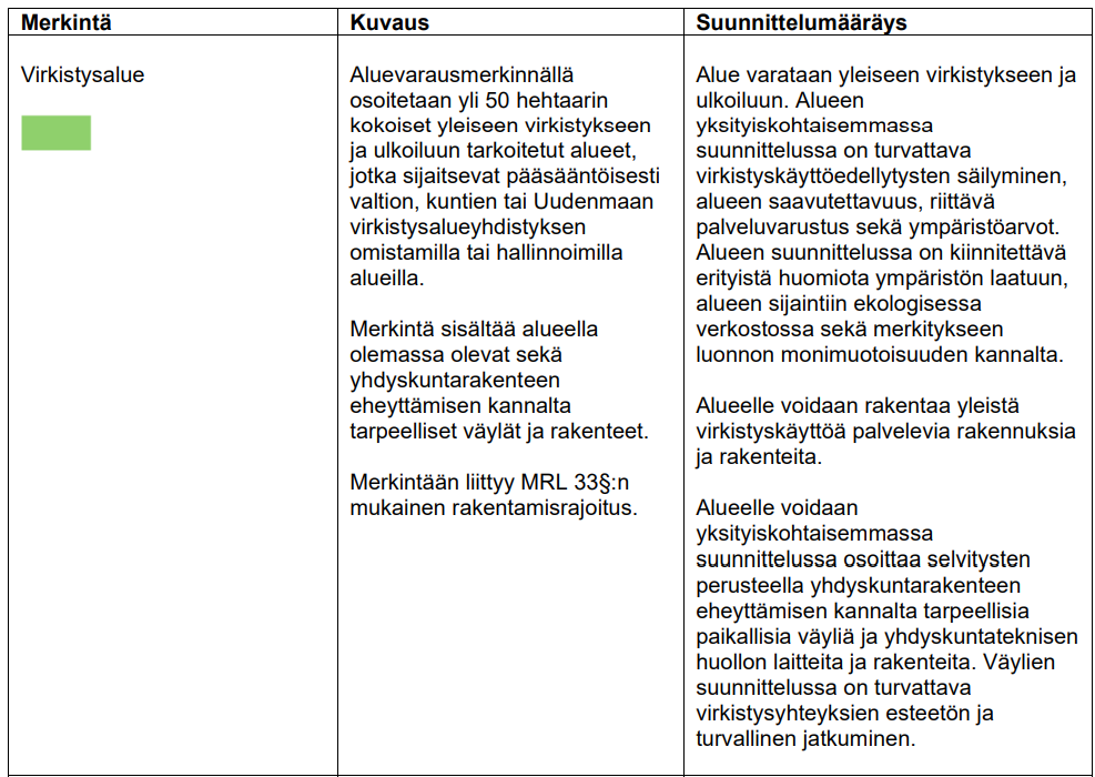 Uusimaa 2050 -kaavan suunnittelumääräyksen mukaan [lihavoinnit lisätty]: ”Alue varataan yleiseen virkistykseen ja ulkoiluun. Alueen yksityiskohtaisemmassa suunnittelussa on turvattava virkistyskäyttöedellytysten säilyminen, alueen saavutettavuus, riittävä palveluvarustus sekä ympäristöarvot. Alueen suunnittelussa on kiinnitettävä erityistä huomiota ympäristön laatuun, alueen sijaintiin ekologisessa verkostossa sekä merkitykseen luonnon monimuotoisuuden kannalta. Alueelle voidaan rakentaa yleistä virkistyskäyttöä palvelevia rakennuksia ja rakenteita. Alueelle voidaan yksityiskohtaisemmassa suunnittelussa osoittaa selvitysten perusteella yhdyskuntarakenteen eheyttämisen kannalta tarpeellisia paikallisia väyliä ja yhdyskuntateknisen huollon laitteita ja rakenteita. Väylien suunnittelussa on turvattava virkistysyhteyksien esteetön ja turvallinen jatkuminen.”