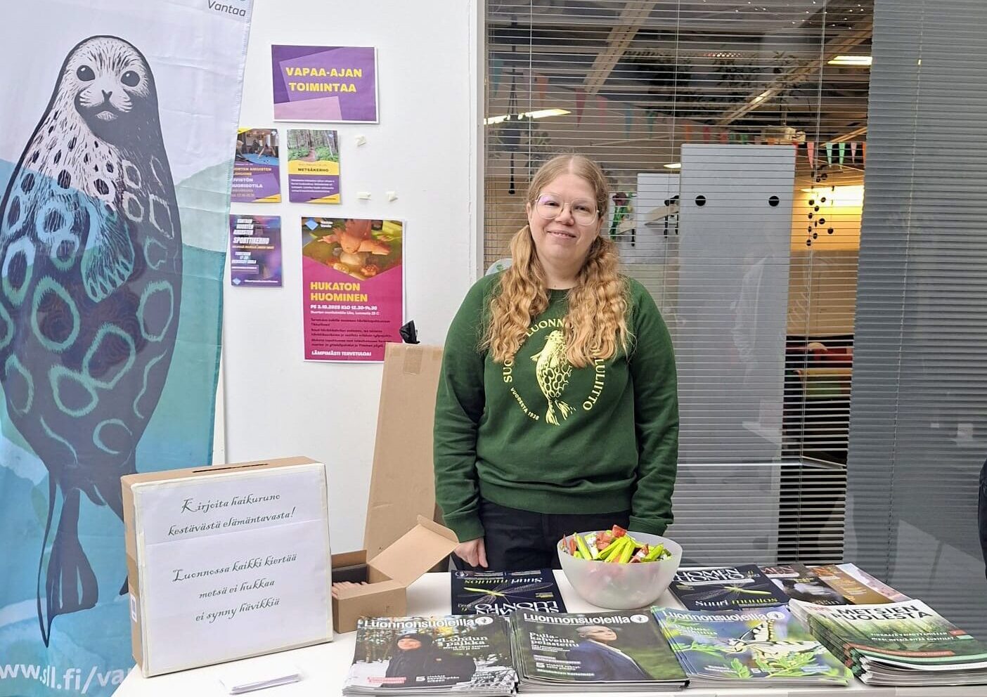 SLL Vantaan ständillä tapahtumassa esiteltiin yhdistyksen toimintaa ja jaettiin Luonnonsuojelija -lehtiä. Halukkaat saivat myös kirjoittaa runolaatikkoomme haikurunon luonnosta tai kestävästä elämäntavasta. Haikuruno koostuu kolmesta säkeestä, joista ensimmäisessä on seitsemän tavua, seuraavassa viisi tavua ja viimeisessä jälleen seitsemän tavua (tarvittaessa tavujen määrässä voi joustaa!) . Tämä on kohtuullisen helppo malli, jolla aloittelijakin saa tehtyä nopeasti hyvältä kuulostavan runon. Kokeile vaikka itse!