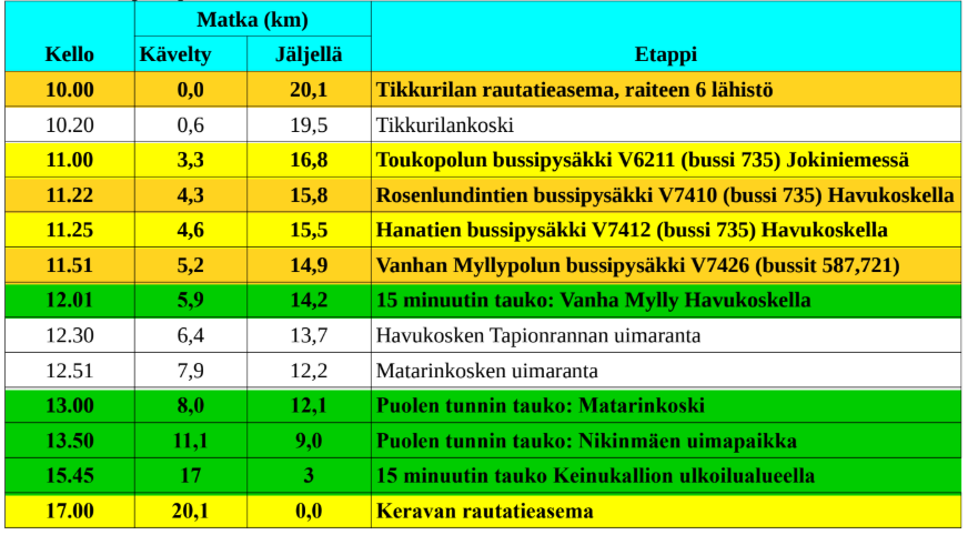 Vaellamme Tikkurilasta Keravanjoen rantoja pitkin Keravalle. Retki päättyy Keravan rautatieasemalle. Reitin kokonaispituus on noin 20 km. Retki alkaa klo 10 ja päättyy vauhdistamme riippuen klo 16 ja 18 välillä Keravan rautatieasemalle.