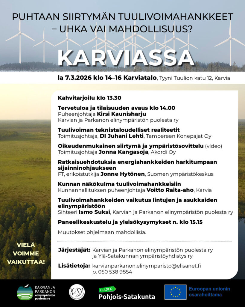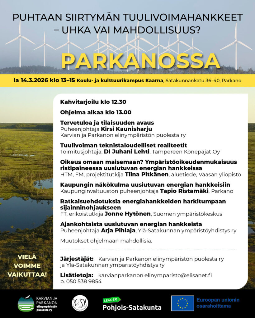 Keskustelutilaisuuksien esitysdiat nyt pdf-muodossa, aukeavat uuteen välilehteen. Tervetuloa ja tilaisuuden avaus, puheenjohtaja Kirsi Kaunisharju Tuulivoiman teknistaloudelliset realiteetit, toimitusjohtaja, DI Juhani Lehti Oikeudenmukainen siirtymä ja ympäristösovittelu, toimitusjohtaja Jonna Kangasoja Kokemuksellisuus, lajireaktiot ja…